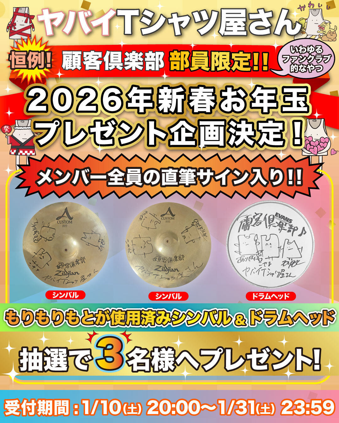 もりもりもとの使用済みシンバル&ドラムヘッドに、メンバー全員の直筆サインを入れて、3名様にプレゼントいたします!!